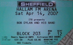 While last time I got a lift to the venue, we went to pubs and excellent Italian restaurants (Leoni’s in Manchester: lovely calzones), this trip was less luxurious, though it certainly had defining moments of its own. For the most part, this was the trip in which Lady Luck was smiling on our trio of Dylan fans. We got a train to Sheffield, but the views were nice (when not travelling through Barnsley) and I got my friend to call in a favour after he availed fellow travellers with the football scores; a near-pensionable couple on our side, we got off a stop early – Meadowhall – and got a tram to the arena.