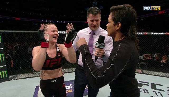 While this wasn’t as amusing, Shevchenko made Peña eat her words by tapping her out to a second round arm bar. What made this more satisfying was the perception among many that Shevchenko was merely a kickboxer, and if the wrestler Peña would be able to take the Kyrgyz down, she’d use her superior grappling skills to earn either a ground and pound stoppage or a submission of her own.